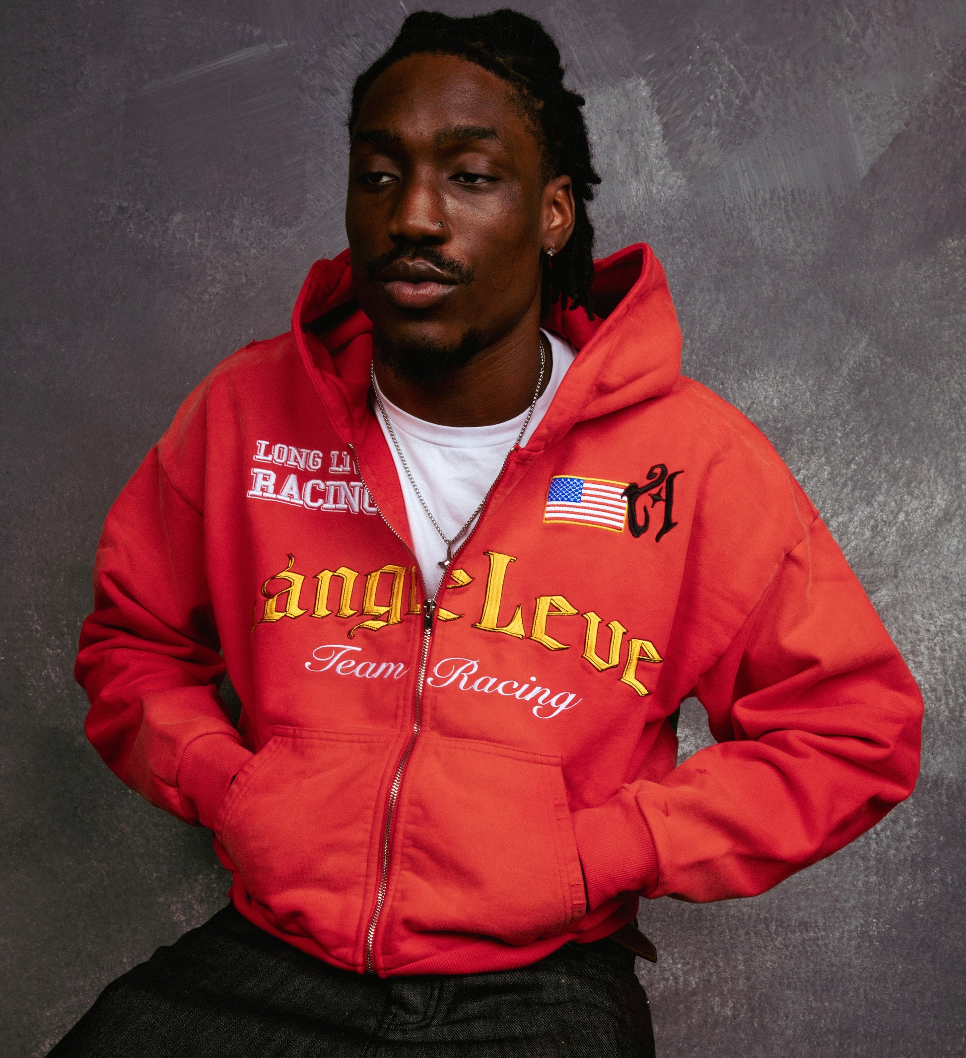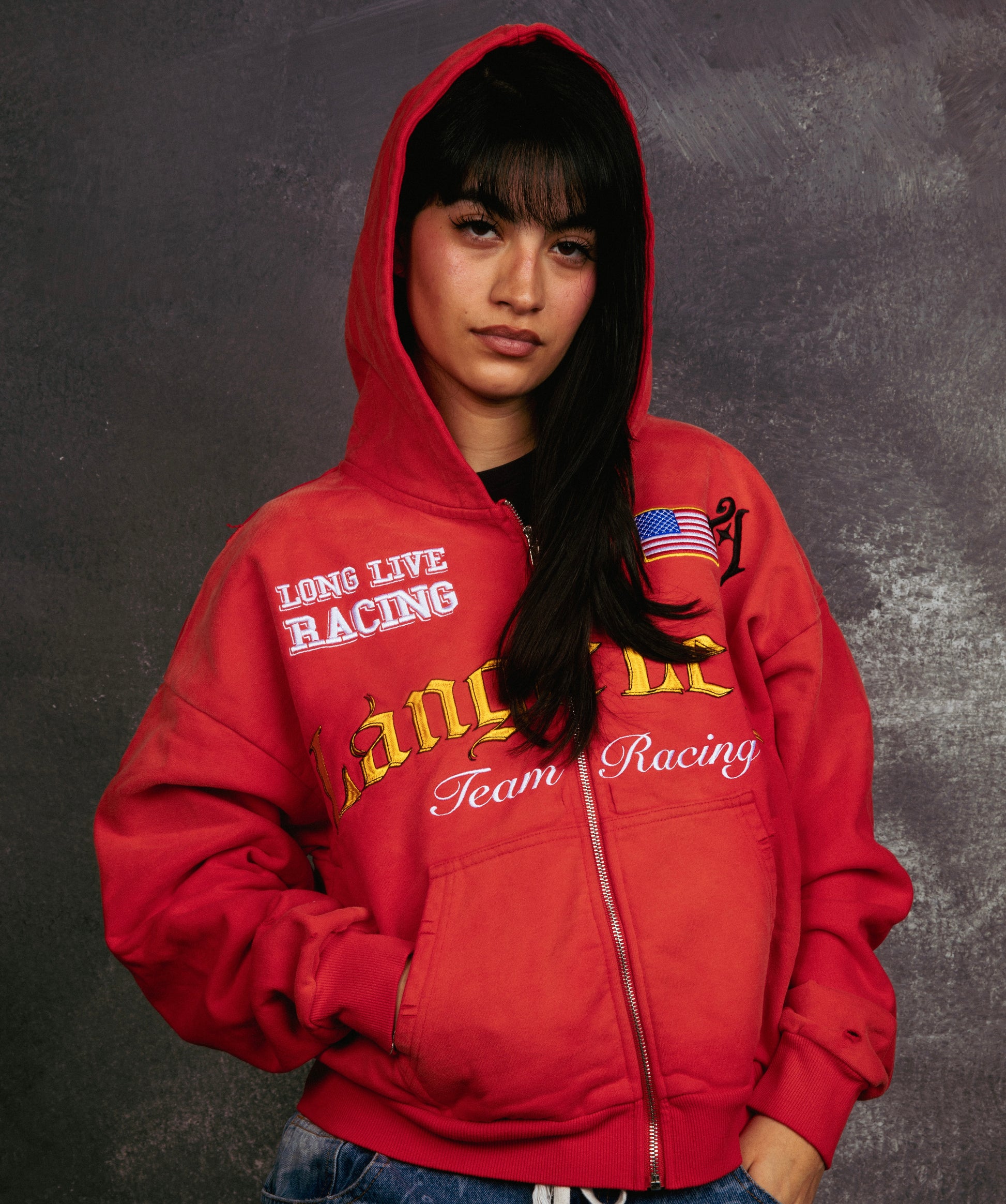 This cherry red zip up hoodie features elegant embroidery work all through out the fabric. It is a vintage racing inspired garment with a vintage look and minor distressing. Soft, heavyweight, and comfortable. The “Lange Leve” text is a Dutch translation for “LongLive”.